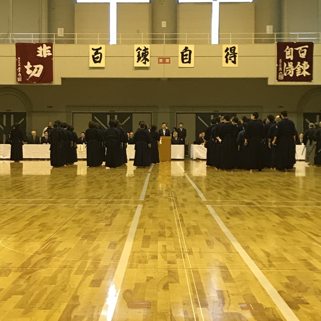 3時間、33人と壮絶な試合を繰り広げる同大会会場の正面に掲げられているえんじ色の2旗。実は右側の「百錬自得」は泉武館道場旗。そして、左側の「非切」は、現館長が外部コーチをしている中村第一中学校剣道部部旗だったことは、あまり知られていません。
